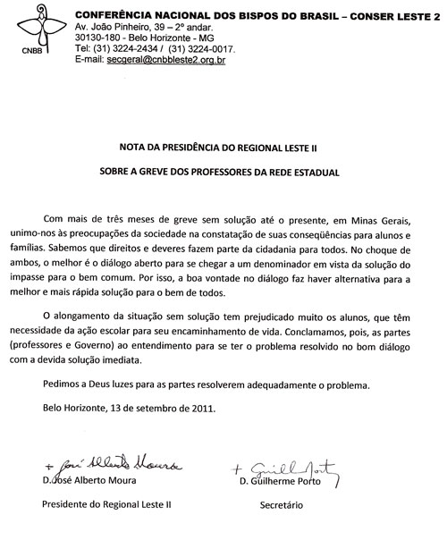 Nota da CNBB sobre a greve dos professores em Minas Gerais
